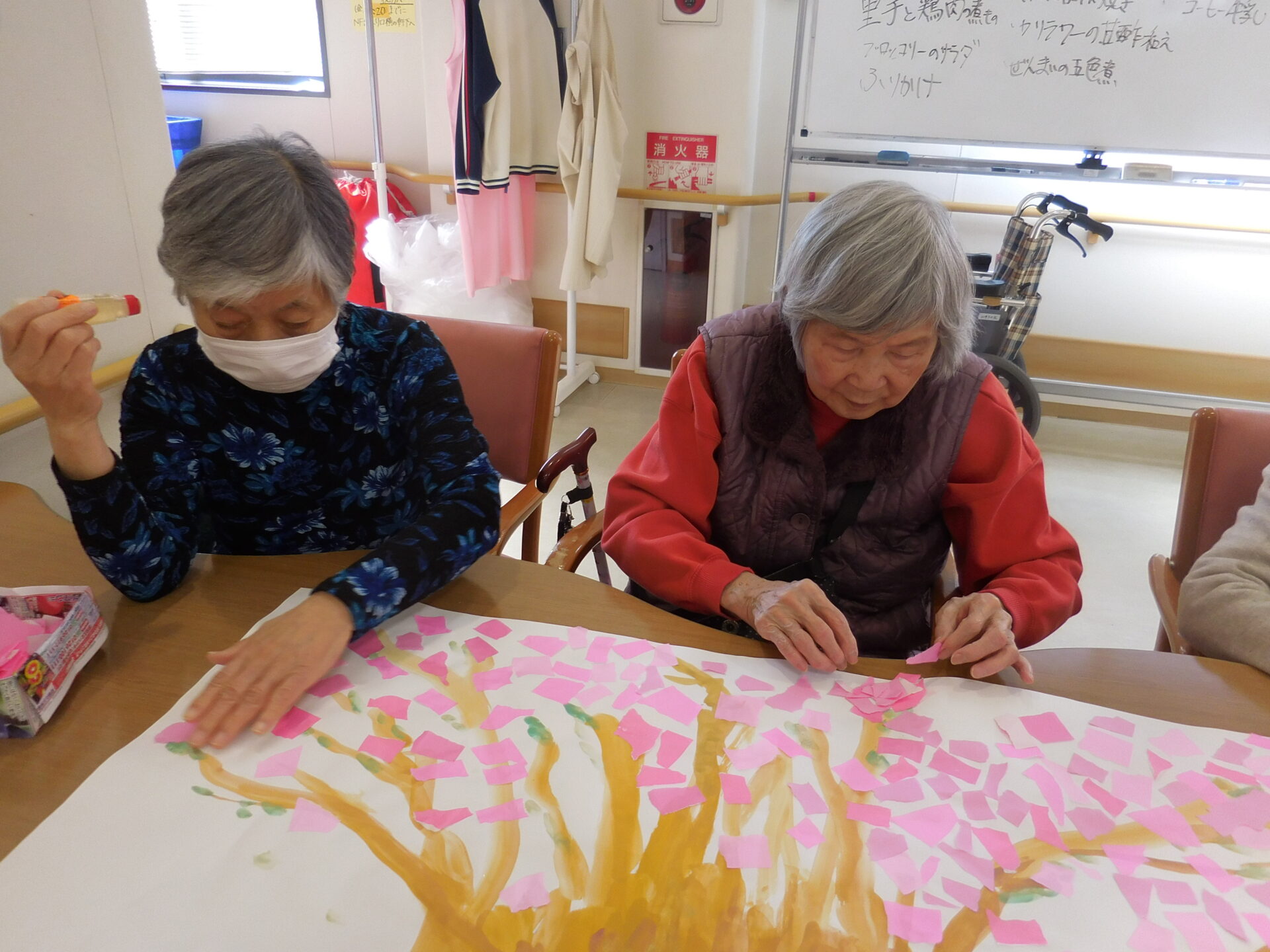 苑内では桜を思い出しながら「ちぎり絵」で桜を作りました。