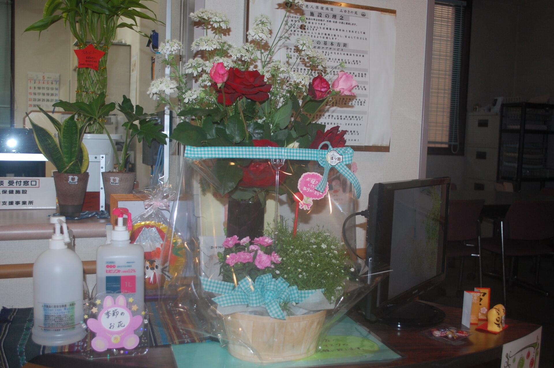 そして、利用者様全員のお母さんにと…受付にお花を