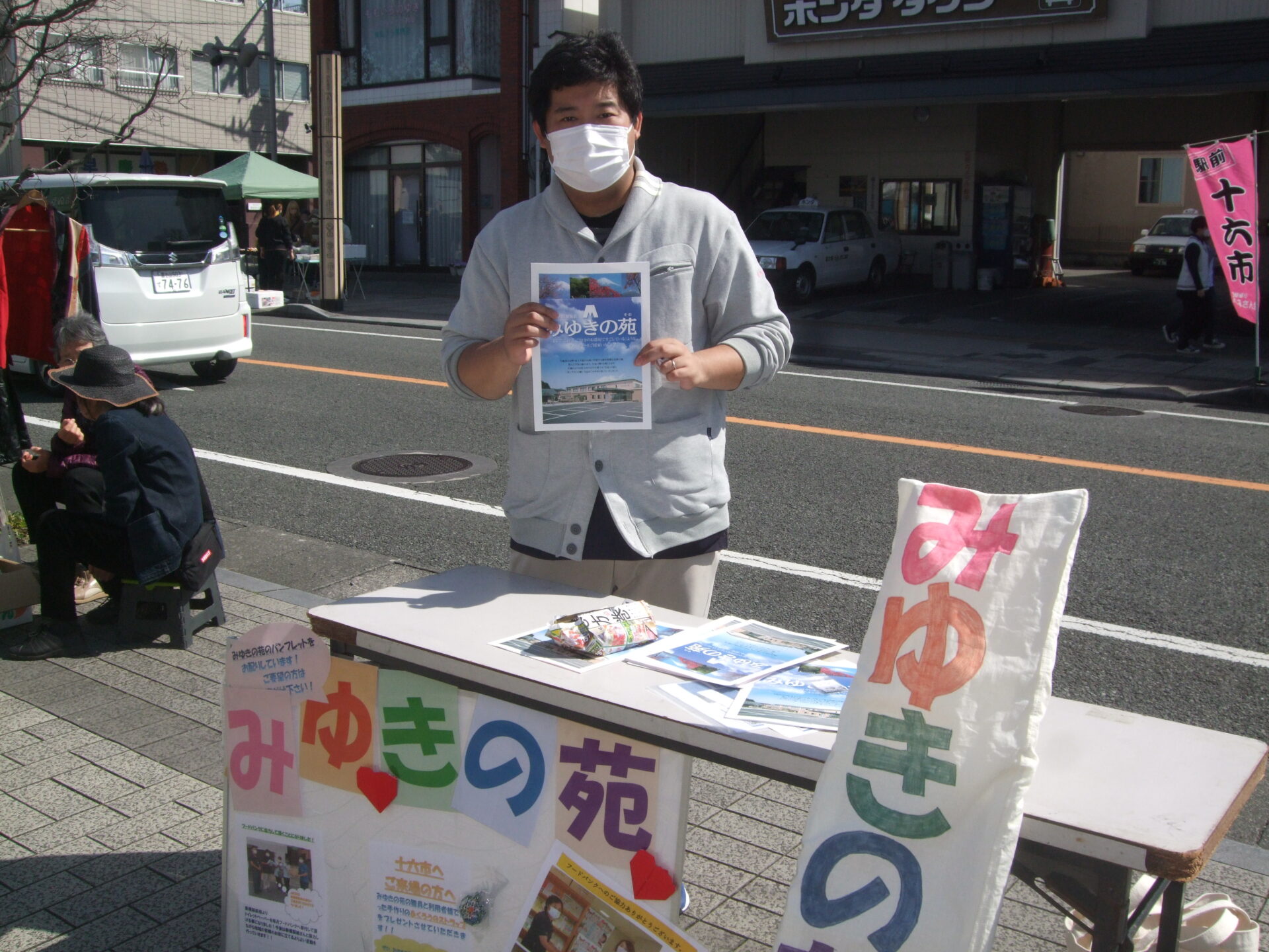 みゆきの苑のパンフレットを配りながら、手作りのフクロウのストラップや、