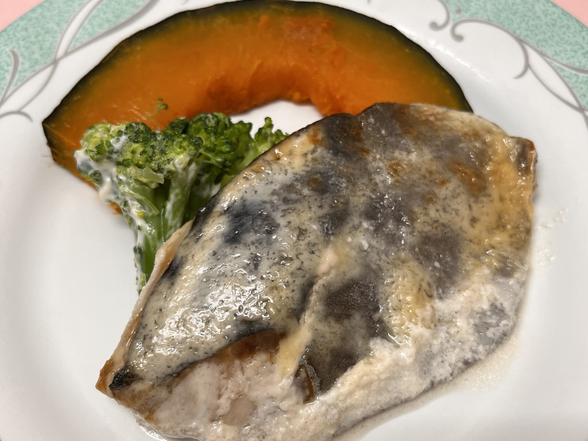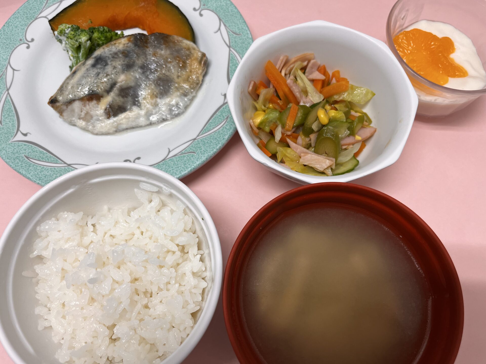 【6/22】 ・ご飯 ・鯵のマヨわさ焼き ・蒸し南瓜、ブロッコリー ・和風ドレサラダ ・お味噌汁 ・フルーチェ