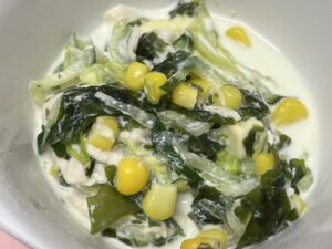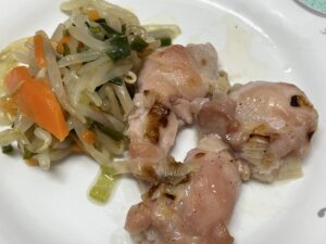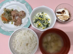【9/19】 ・ごはん ・鶏のねぎ塩焼き ・三色ソテー ・ささみ入りサラダ ・お味噌汁 ・バナナムースチョコソースがけ