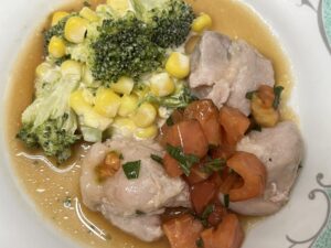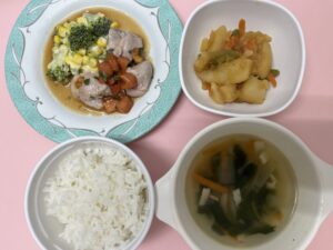 【9/23(祝)】 ・ごはん ・チキンのトマトポン酢ソース ・じゃが芋のきんぴら風 ・ジンジャースープ