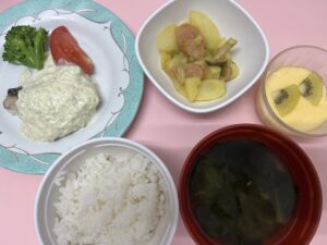 【10/10】 ・ごはん ・鯵のパン粉焼き 和風タルタル ・じゃが芋のカレー炒め ・お味噌汁 ・オレンジムース