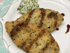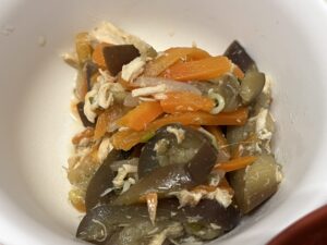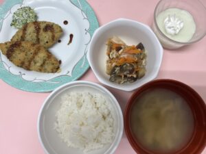 【11/4】 ・ごはん ・白身魚のチーズ磯辺揚げ ・ブロッコリーサラダ ・茄子の中華和え ・さつま汁 ・メロンムース