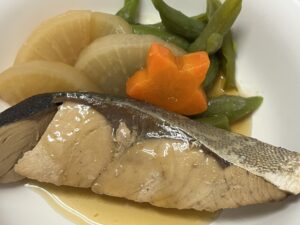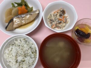 【11/6】 ・菜飯ご飯 ・ぶり大根 ・いんげん煮、花人参 ・キノコの白和え ・お味噌汁 ・あんみつ