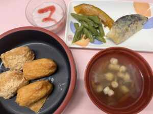 【11/13】 ・稲荷寿司 ・鯵の葱マヨ焼き ・いんげんの生姜醤油和え ・蒸し南瓜 ・エビ団子汁 ・ストロベリームース