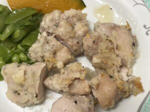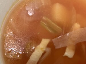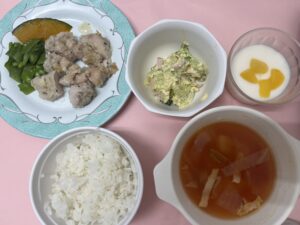 【12/8】 ・ごはん ・鶏肉のハーブパン粉焼き ・スナップエンドウ、蒸し南瓜 ・ブロッコリーサラダ ・ミネストローネスープ ・フルーチェ