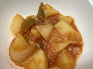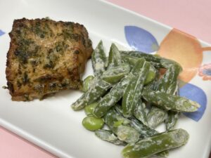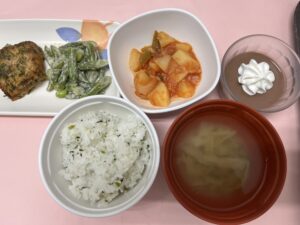 【12/9】 ・菜飯ごはん ・かれいの磯辺焼き ・グリーンゴママヨ和え ・じゃが芋のトマト煮 ・お味噌汁 ・チョコムース