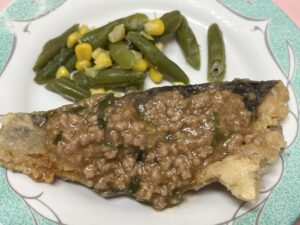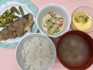 【1/8】 ・ご飯 ・揚げ鯖の柚子麻婆 ・いんげんとコーンのソテー ・白菜のサラダ ・お味噌汁 ・オレンジムース