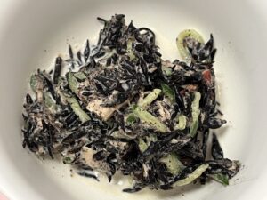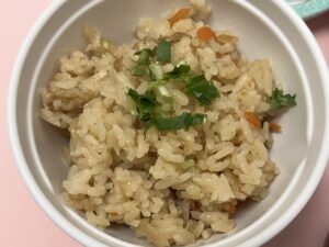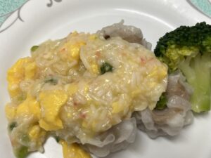 【1/16】 ・かやくごはん ・焼売の卵あんかけ ・ブロッコリー ・ひじきサラダ ・お味噌汁 ・ぶどうムース