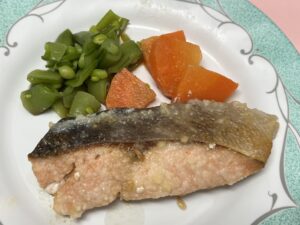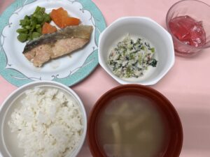 【1/19】 ・ご飯 ・鮭の和風ステーキ ・スナップエンドウ、グラッセ ・小松菜と梅じゃこの白和え ・お味噌汁 ・ぶどうゼリー