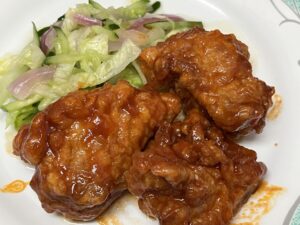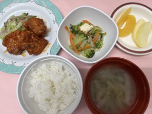 【2/9】 ・ごはん ・ヤンニョムチキン ・グリーンサラダ ・ブロッコリーガーリックソテー ・お味噌汁 ・フルーツ