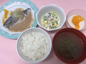 【3/23】 ・ごはん ・鯖のほうじ茶煮ピーナッツソース ・カリフラワー甘酢付け ・ささみのサラダ ・清汁 ・フルーチェ