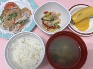 【4/9】 ・ごはん ・豚しゃぶごまだれ ・サラダ菜、トマト ・ブロッコリーのガーリック炒め ・お味噌汁 ・フルーツ