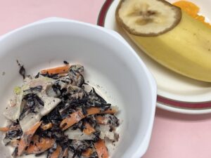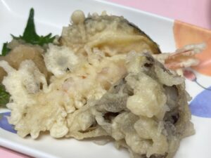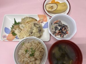 【4/14】 ・かやくごはん ・天ぷら ・大葉、大根おろし、天つゆ ・ひじきのサラダ ・お味噌汁 ・フルーツ