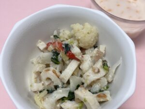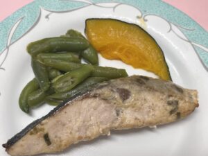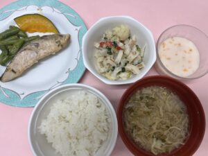 【4/15】 ・ごはん ・ぶりのネギマヨ焼き ・南瓜、いんげん生姜和え ・ごま塩麴和え ・かきたま汁 ・フルーチェ