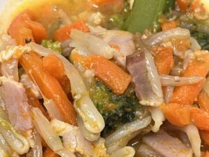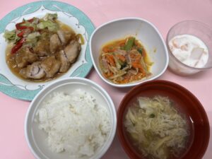 【4/23】 ・ごはん ・鶏の唐揚げネギソース ・グリーンサラダ ・もやしのペペロンチーノ風 ・かきたま汁 ・フルーツヨーグルト