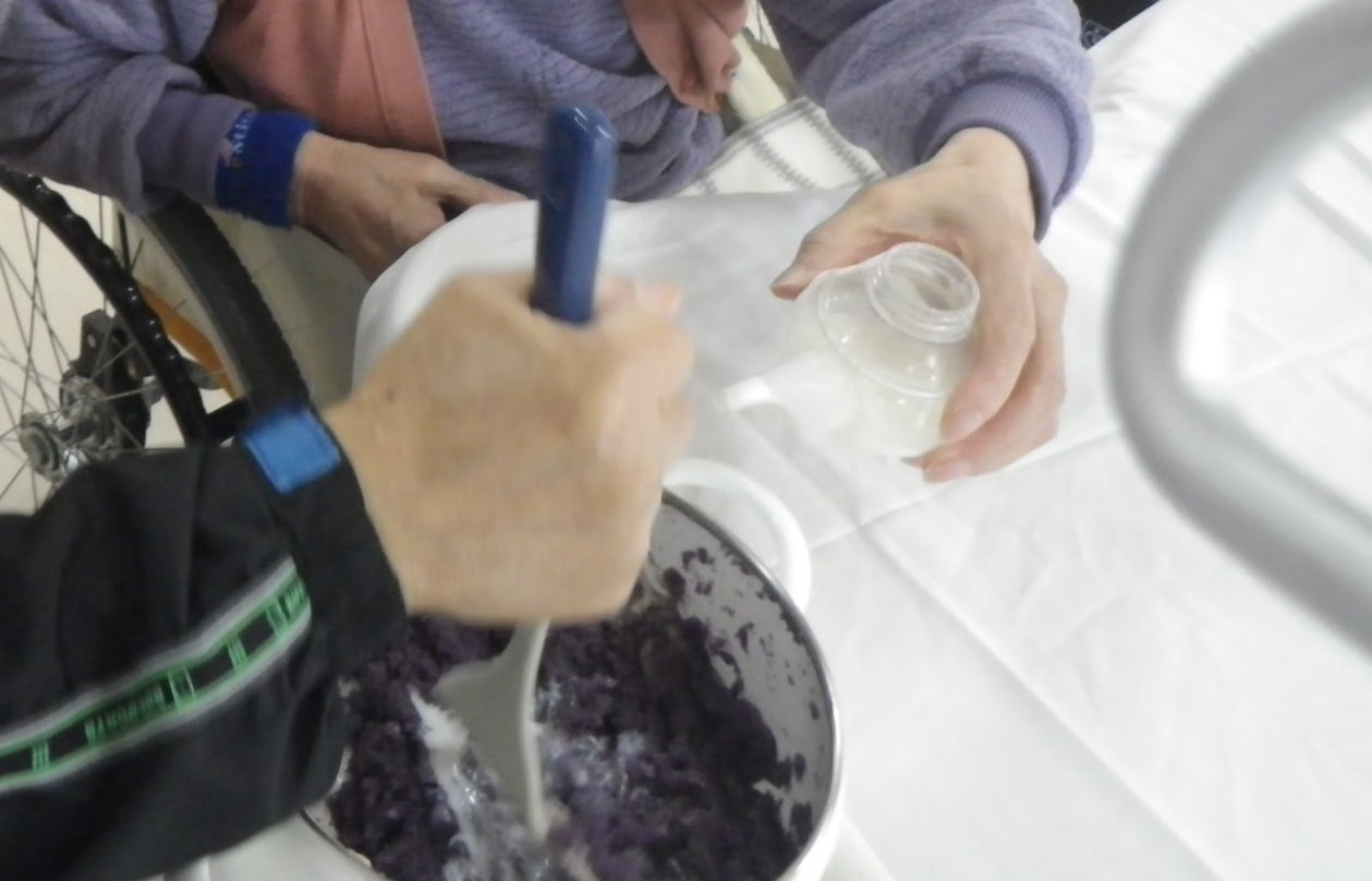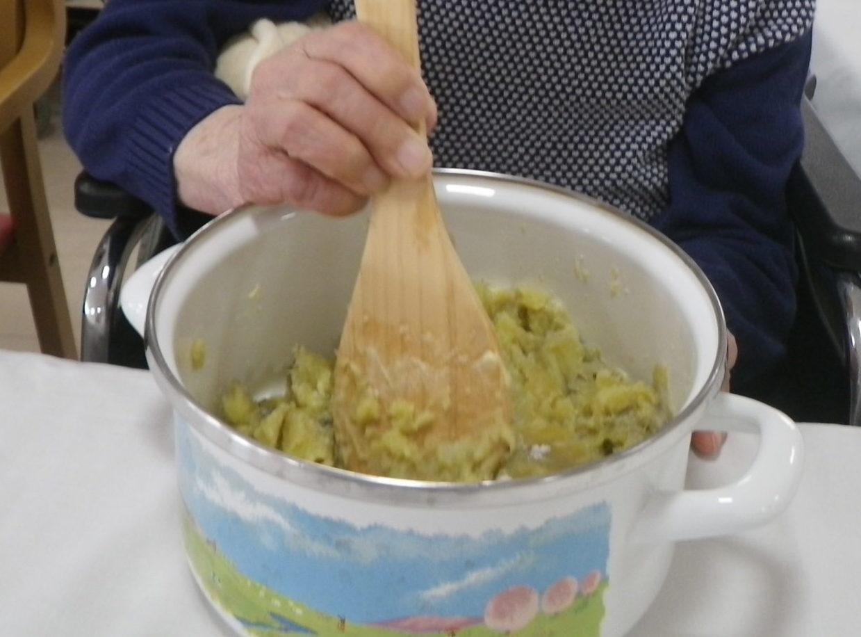 利用者様は全員で協力をして、さつまいもをつぶす係、